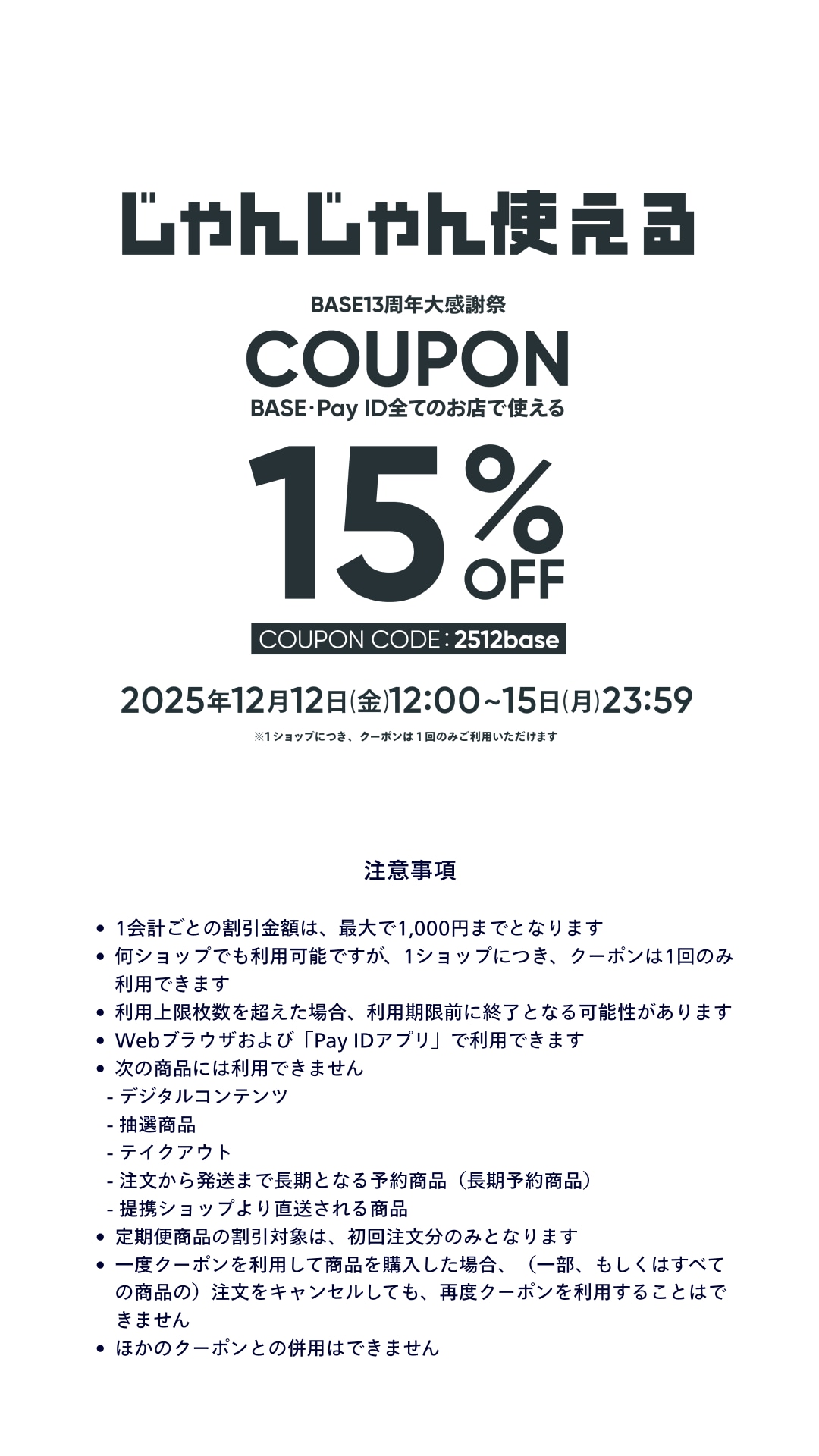 【12/12(金)12時〜 BASE15%OFFクーポン配布♪】