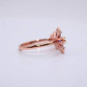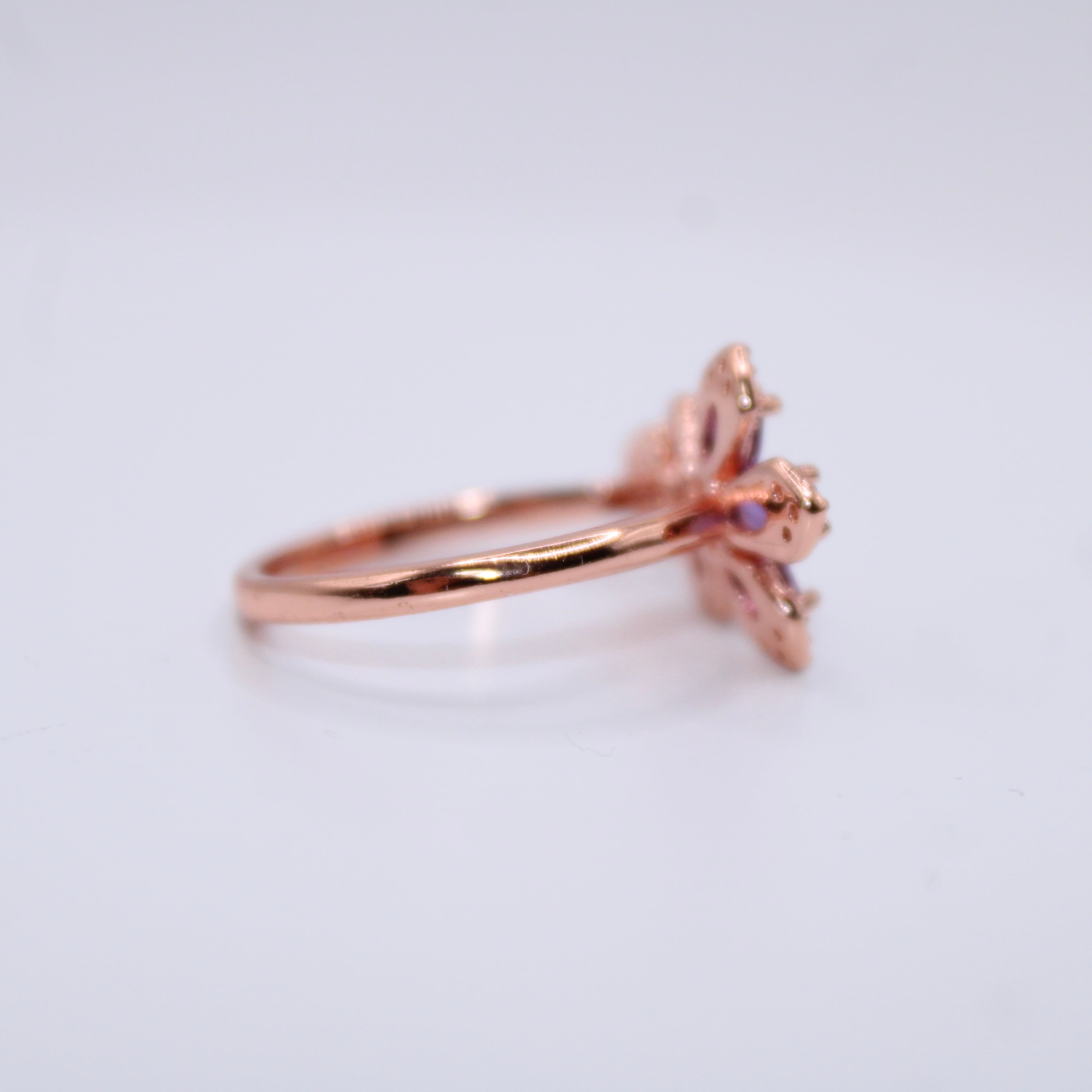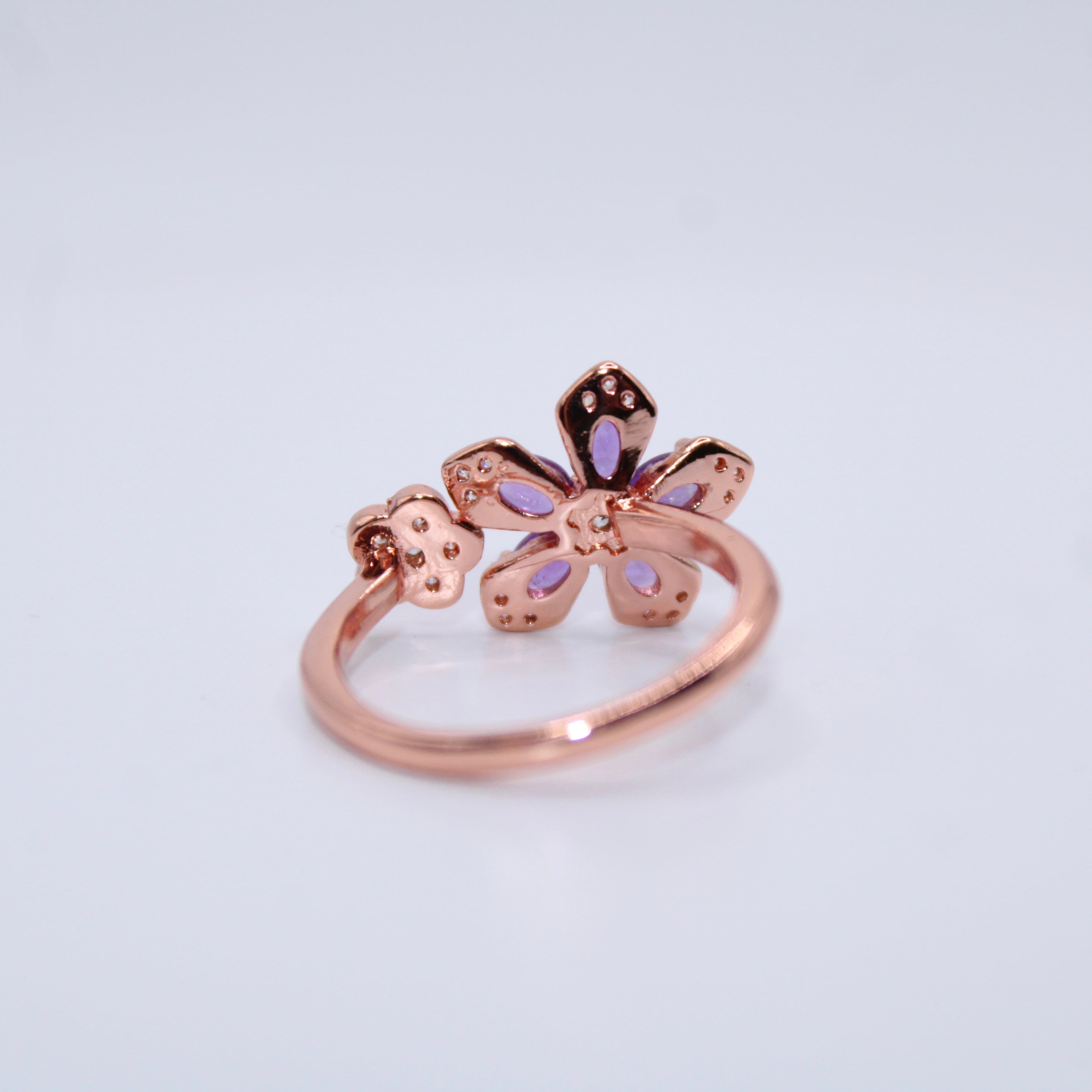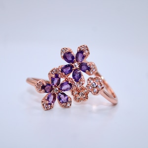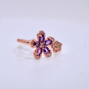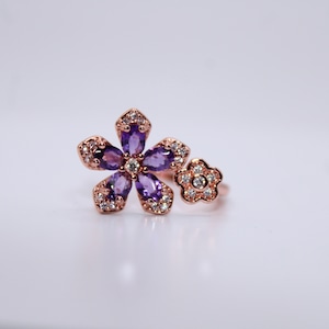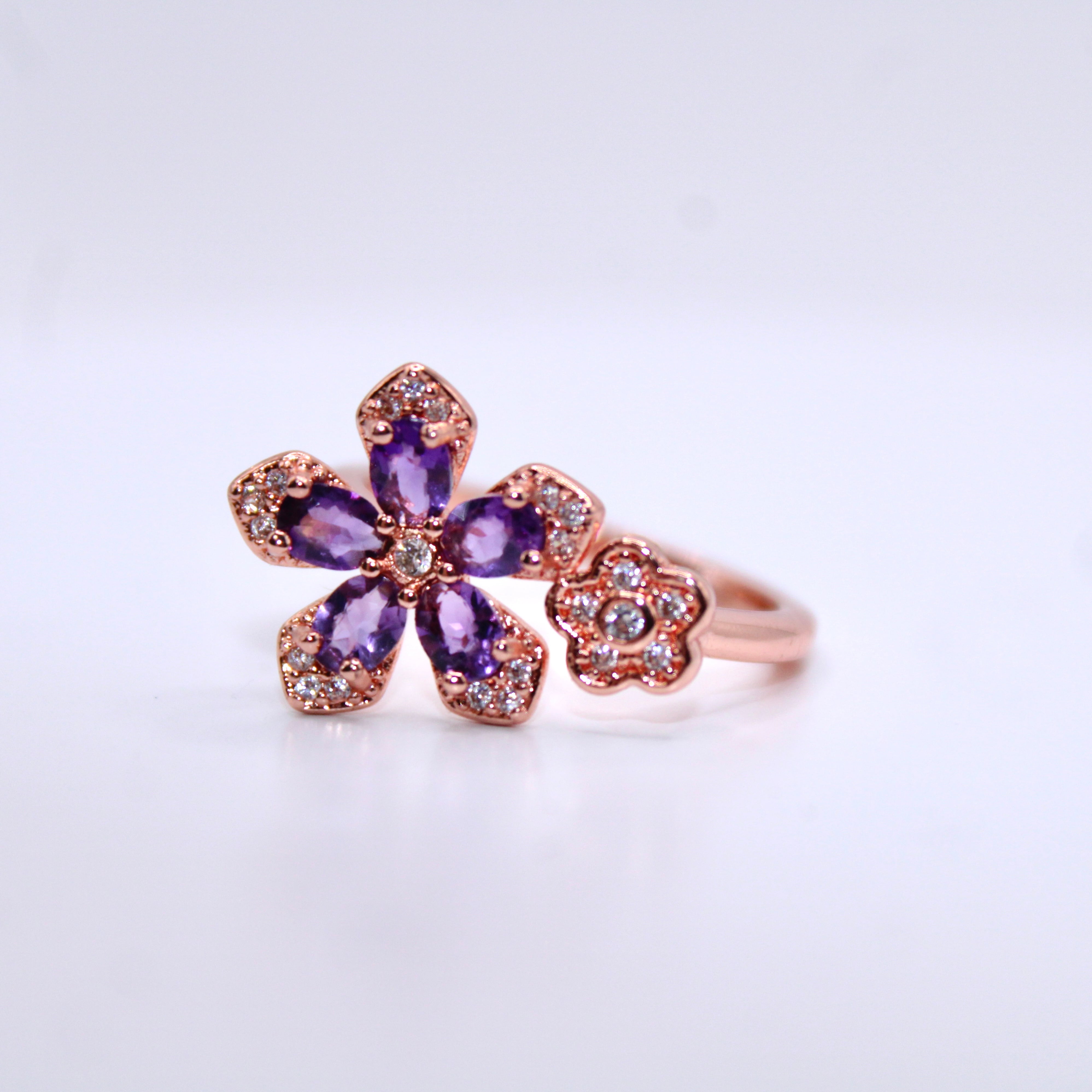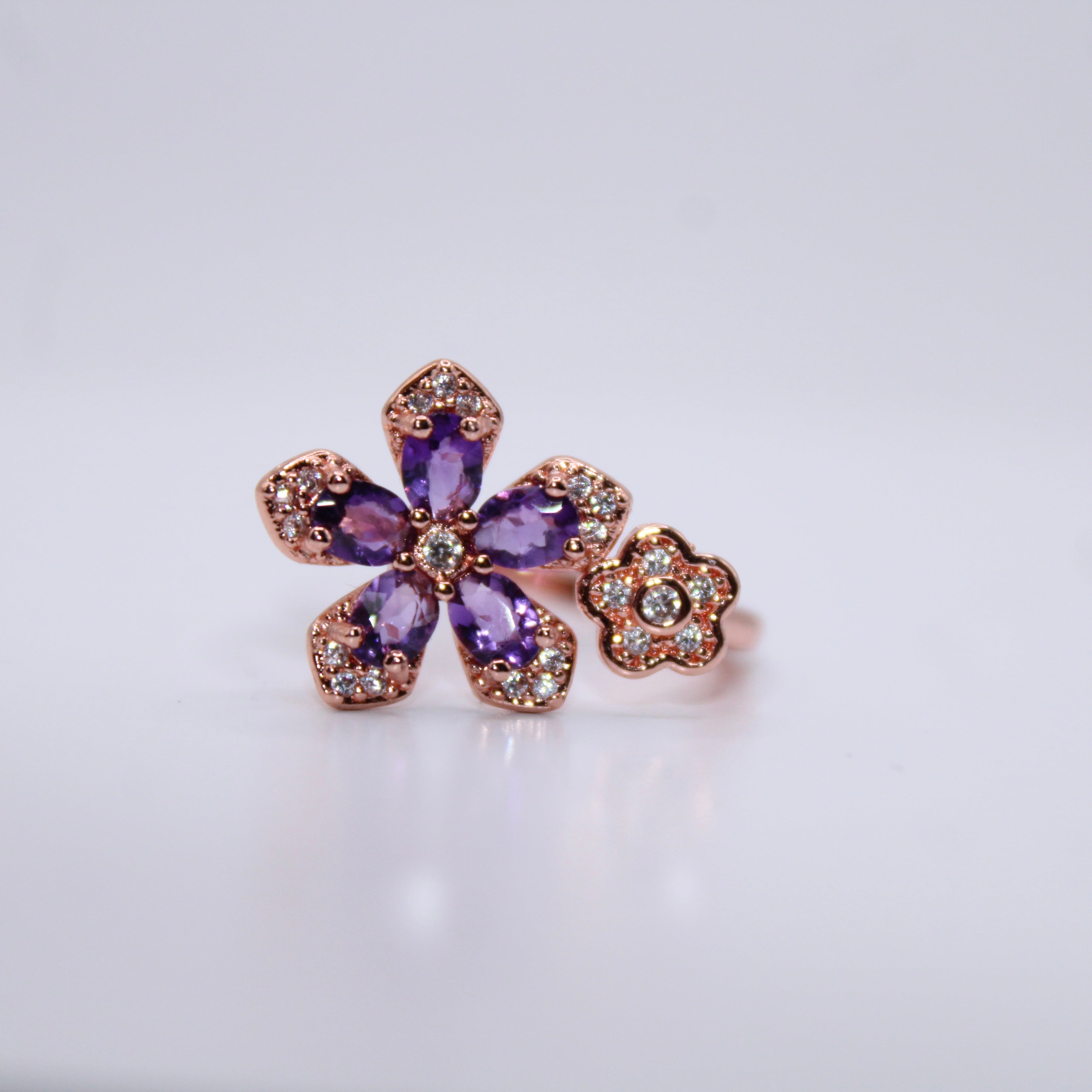 商品コメント:2つの花のモチーフが特徴のデザインとなっており、アメシストの深みのある紫色が