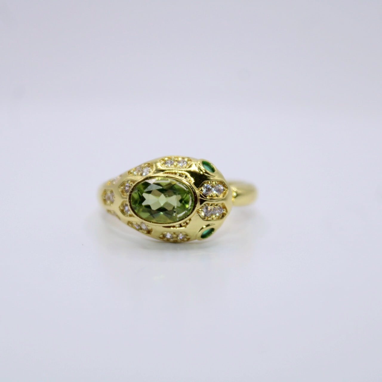 商品コメント: ゴールドの地金にペリドットのルースを使用したプレミアムプライス限定リングの登場!デザインは人気のヘビとなっております♪